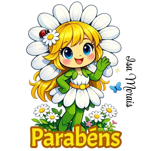 Uma menina de cabelos loiros vestida de flor, com uma joaninha no cabelo e um sorriso. Ela está cercada por flores e a palavra 'Parabéns' está escrita embaixo dela.