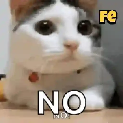 Gato com expressão de desaprovação, olhos arregalados e texto 'NO' e 'Fe' sobreposto.