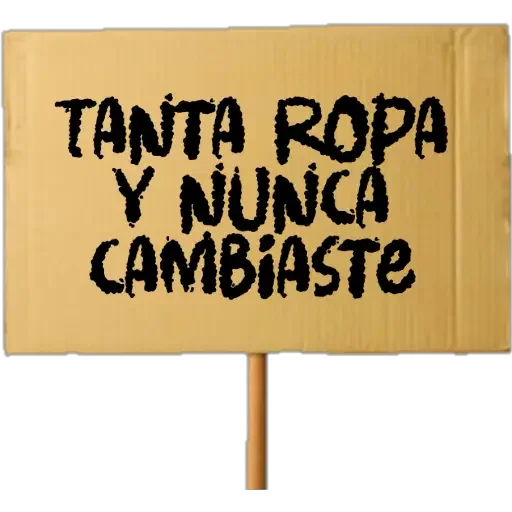 Um cartaz de papelão com a frase 'TANTA ROPA Y NUNCA CAMBIASTE' escrita em preto. O cartaz parece ter uma textura de papelão e uma haste de madeira.