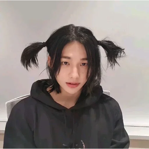 Uma jovem com cabelos pretos e dois coques laterais, vestindo um moletinho preto, olhando para frente com uma expressão neutra.