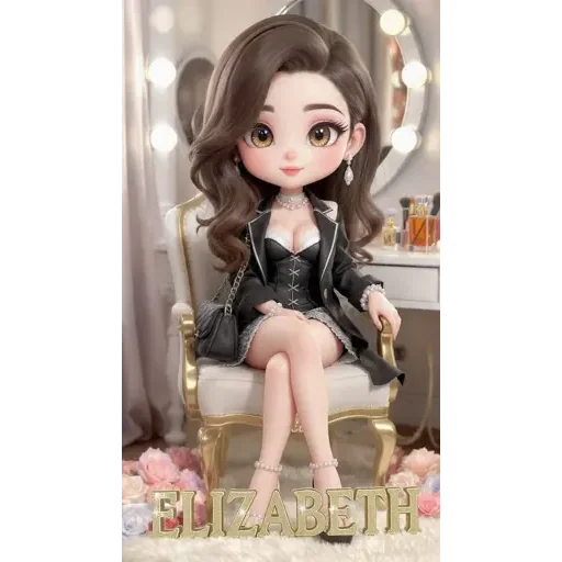 Boneca de estilo anime sentada em uma cadeira dourada, vestindo um vestido preto e branco, com o nome 'ELIZABETH' em letras douradas no chão.