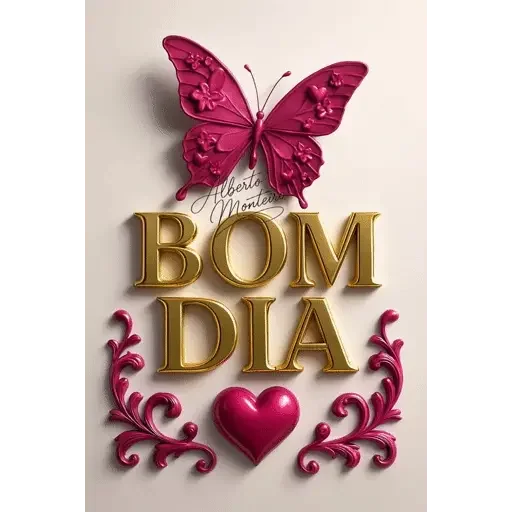 Uma borboleta rosa e um coração vermelho decoram a frase 'BOM DIA' em letras douradas, com ornamentos florais vermelhos.