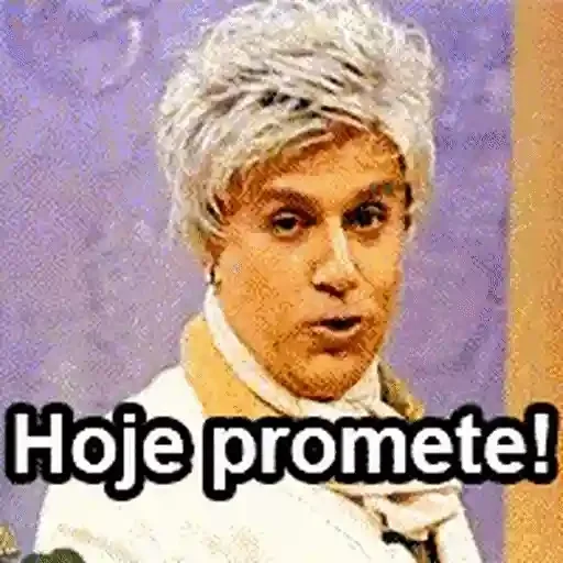 Uma mulher mais velha com cabelo grisalho curto e expressão surpresa, vestindo um casaco branco, contra um fundo roxo. O texto 'Hoje promete!' aparece na parte inferior.