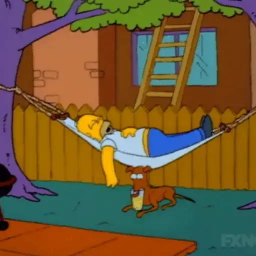 Homem deitado em uma rede, com um cachorro ao lado. Ele está usando uma camisa branca e calça azul. A cena parece ser de um quintal com uma casa ao fundo.