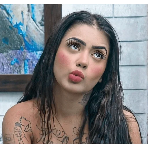 Mulher com cabelo preto e olhos castanhos, olhando para o lado com uma expressão facial pensativa. Ela tem tatuagens no ombro e no colo.
