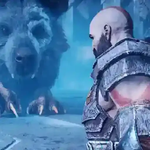 Um homem careca com armadura enfrenta um urso gigante com garras afiadas em um cenário azul desbotado.