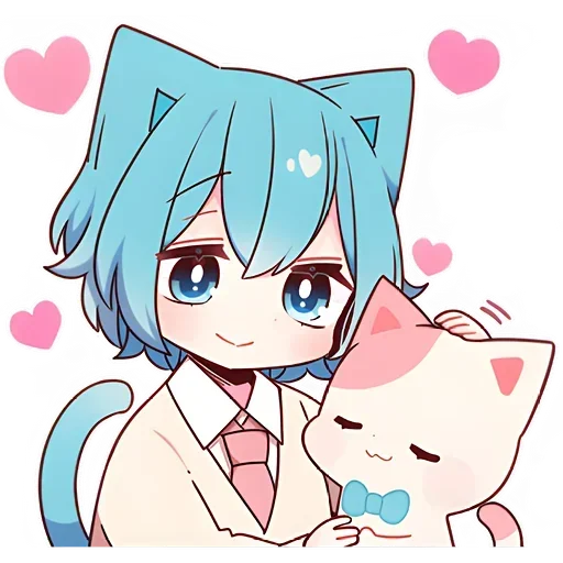 Um menino com cabelo azul e orelhas de gato abraça um gato branco com uma borboleta azul no pescoço, rodeados de corações rosa.