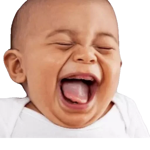 Bebê com os olhos fechados e a língua para fora, parecendo chorar ou gritar, vestindo uma camisa branca.