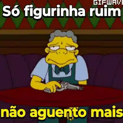 Homem amarelo com expressão de desânimo, sentado à mesa com as mãos sobre um objeto, texto "Só figurinha ruim" e "não aguento mais"