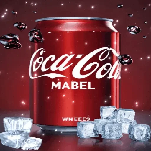 Uma lata de Coca-Cola com o nome MABEL em letras brancas, rodeada de cubos de gelo e faíscas em um fundo vermelho escuro.