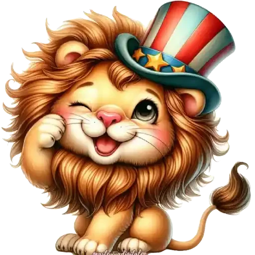Leão cartoon com chapéu de listras vermelhas, brancas e azuis, com estrelas amarelas, fazendo careta e com a mão no rosto.