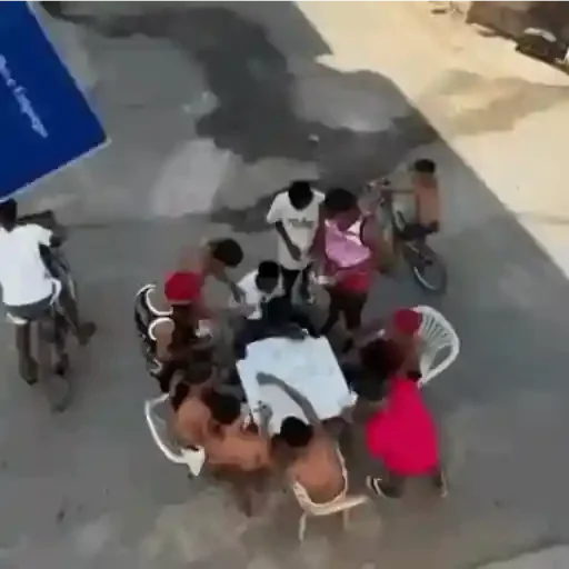 Grupo de crianças sentadas em torno de uma mesa ao ar livre, algumas em bicicletas, em um ambiente de rua com sombra.