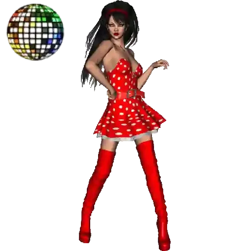 Uma mulher com cabelo preto e um vestido vermelho com manchas brancas dançando em frente a uma bola de discoteca colorida.