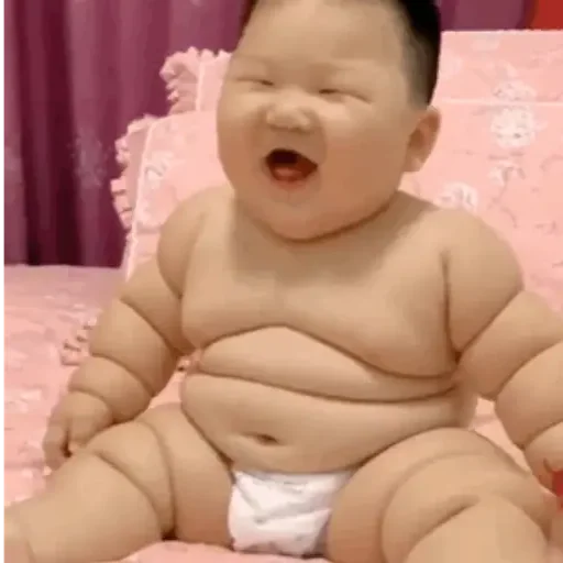 Um bebê gordo e nu, com muitas dobras de gordura, sentado em uma cadeira rosa, com a boca aberta como se estivesse chorando ou gritando.
