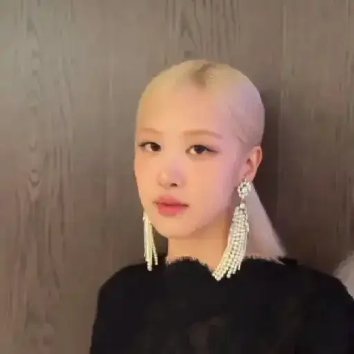 Mulher jovem com cabelo platinado e brincos longos, vestindo uma blusa preta, com expressão neutra.