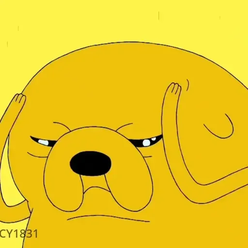 Cachorro amarelo com as mãos na cabeça e boca aberta, parecendo surpreso ou estressado.