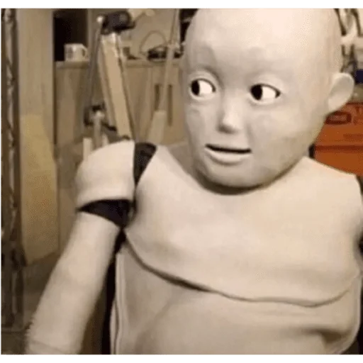 Um boneco de animação com expressão surpresa e boca ligeiramente aberta, em um ambiente que parece um estúdio ou oficina.