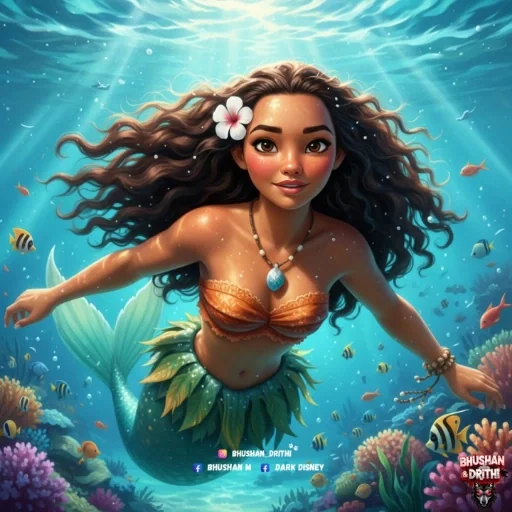 Uma mulher com longos cabelos castanhos e uma flor branca no cabelo, vestindo uma saia de folhas e um colar com uma pedra azul, é retratada como uma sereia submersa em água azul rodeada de peixes e coral colorido.