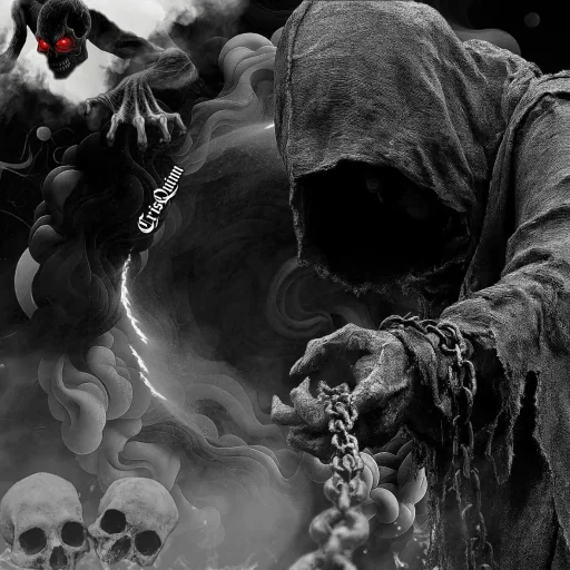 Uma figura sombria com capuz e correntes, cercada por fumaça e crânios, com outro personagem ao fundo com olhos vermelhos.