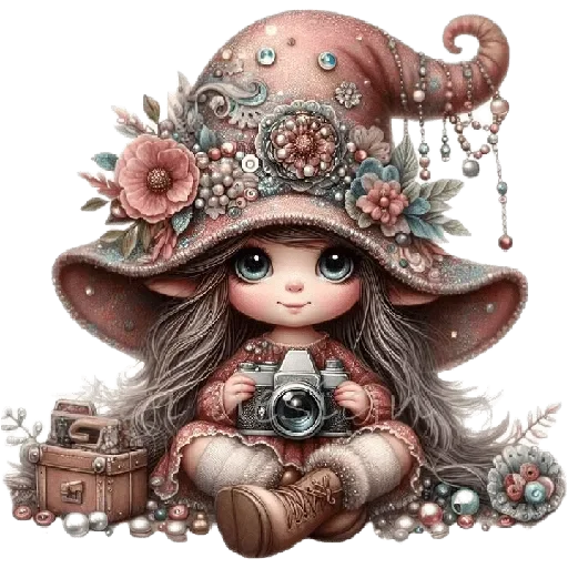 Uma menina fofa com um chapéu grande decorado com flores e joias, segurando uma câmera fotográfica. Ela tem cabelos longos e castanhos e está sentada com um baú ao lado.