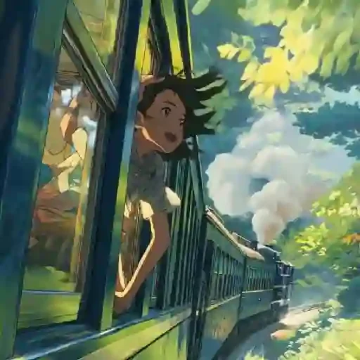 Uma menina com cabelos castanhos e um vestido olha para fora de um trem em movimento, com uma expressão surpresa no rosto. O cenário ao fundo mostra árvores verdes e nuvens brancas.