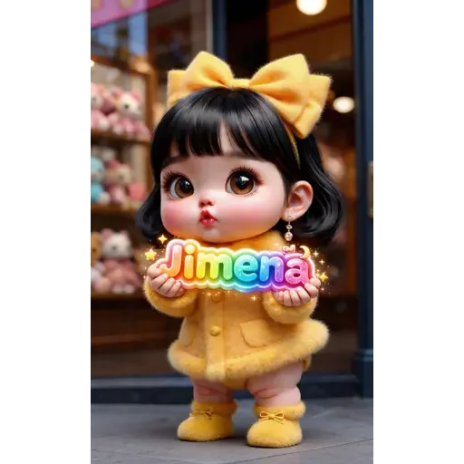 Menina de cabelo preto com franja e um laço amarelo na cabeça, vestindo um conjunto amarelo, segura uma placa colorida com o texto 'Linda'.