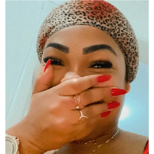 Mulher com turbante e unha vermelha cobrindo a boca com a mão, com expressão surpresa ou chocada.