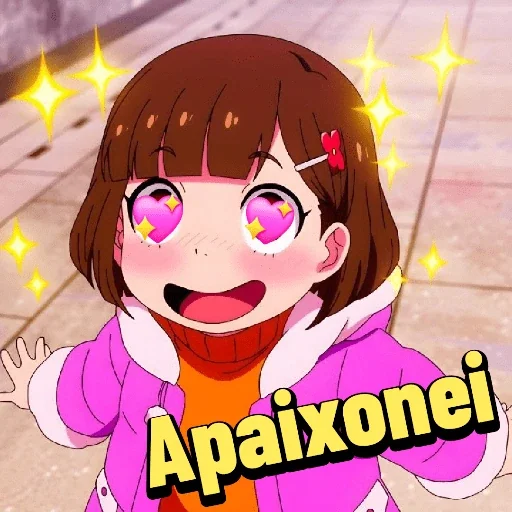 Menina de anime com cabelo castanho e olhos rosa, usando um casaco rosa, com a palavra 'Apaixonei' em amarelo. Ela parece feliz e surpresa.