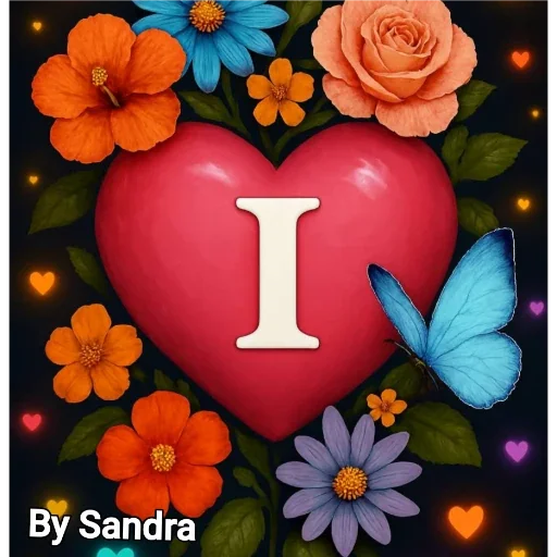Um coração vermelho com a letra 'I' no centro, rodeado de flores coloridas, incluindo rosas, e um borboleta azul. O fundo é preto com pequenos corações e estrelas.