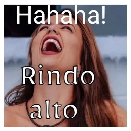 Mulher com a boca aberta e olhos fechados, parecendo rir alto. Sobreposta com o texto 'Hahaha! Rindo alto'