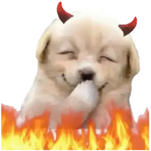 Um cachorrinho fofo com chifres de diabo e chamas ao redor, parecendo travesso.
