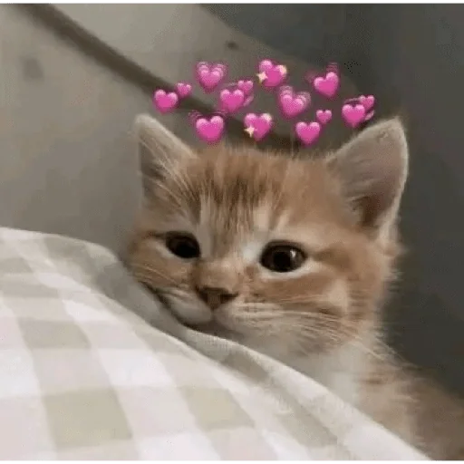 Gatito de olhos grandes e pelagem laranja com corações rosa sobre a cabeça.