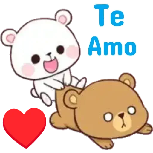 Um ursinho branco com uma expressão feliz está montado em um ursinho marrom com uma expressão de surpresa. O ursinho branco tem as bochechas rosadas e um coração vermelho está ao lado. A frase 'Te Amo' está escrita em azul.