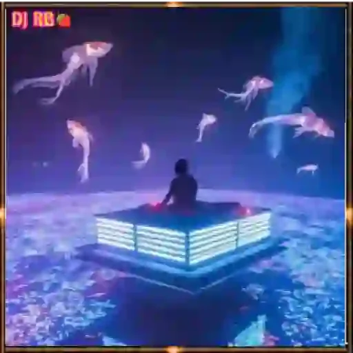Um homem sentado em uma plataforma com luzes azuis, cercado por peixes luminosos em um ambiente noturno. Ao lado esquerdo superior, aparece 'DJ RB' em letras vermelhas.