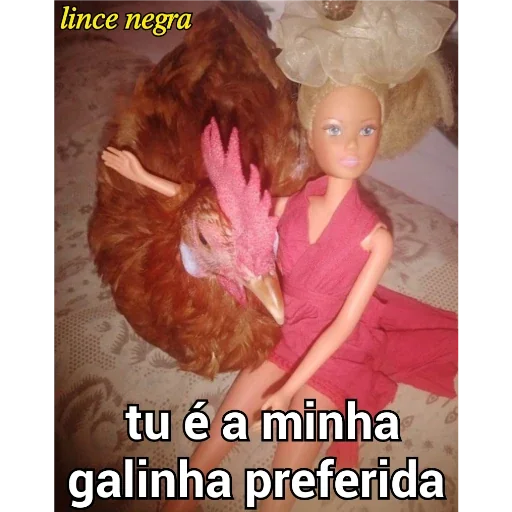 Boneca de plástico loira com vestido rosa ao lado de um ursinho marrom, com uma pequena boneca rosa com asas. Legenda 'tu é a minha galinha preferida' e 'lince negra' no canto.