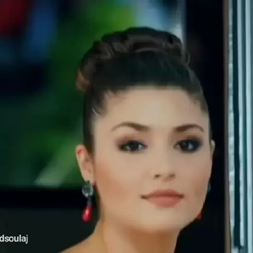 Rosto de uma mulher com cabelo castanho preso, olhos castanhos e brincos vermelhos. Ela está olhando para o lado com uma expressão neutra.