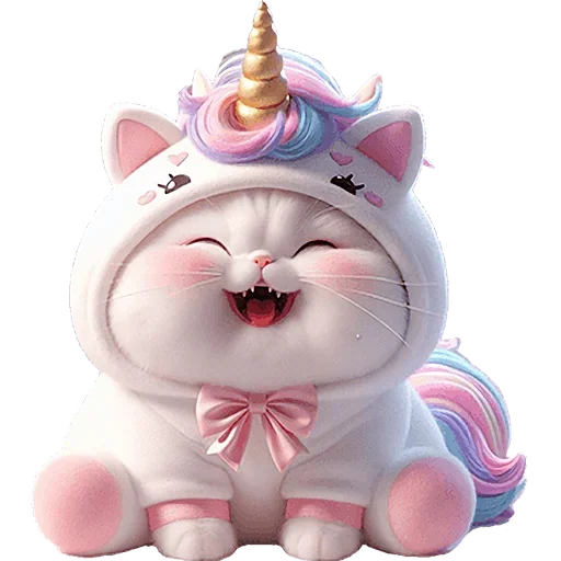Gatito fofinho vestido de unicorniu com chifre dourado, cabelo rosa e azul, olhos fechados e língua de fora.