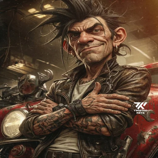Um homem com piercings e tatuagens, vestindo uma jaqueta de couro marrom e um colar, com os braços cruzados em frente a um carro vermelho. Ele tem um olhar sério e spiky hair.