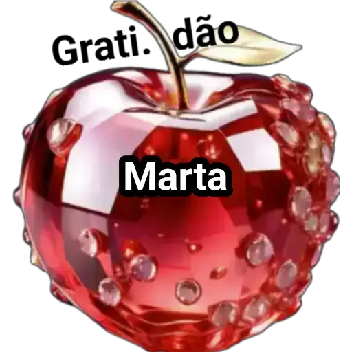 Uma maçã vermelha brilhante com gotículas de água, com o texto 'Gratidão Marta' sobreposto.
