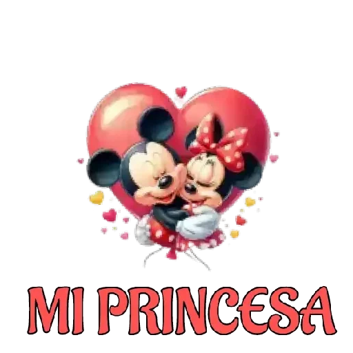 Mickey e Minnie Mouse abraçados em um coração vermelho gigante com balões e corações ao redor, com o texto 'MI PRINCESA' em vermelho abaixo.