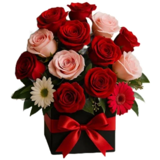 Um buquê de rosas vermelhas e rosa claro com algumas flores brancas e vermelhas adicionais, em um vaso preto com um laço vermelho.