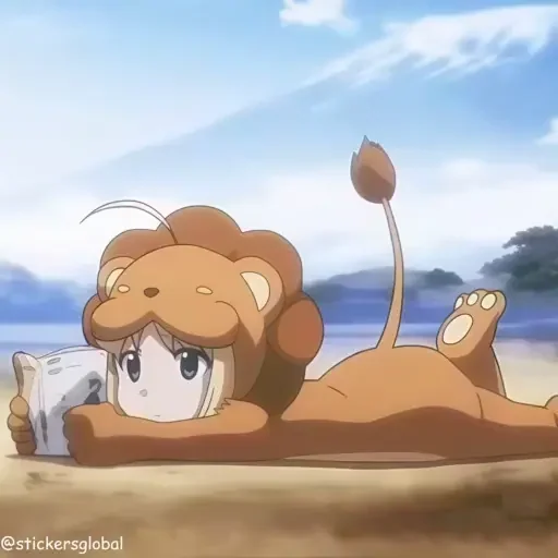 Uma menina de olhos arregalados usando uma fantasia de leão, deitada na areia com um livro, ao lado de uma cauda de leão, em um cenário de praia com montanhas ao fundo.