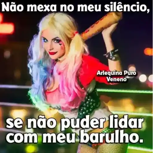 Harley Quinn com um taco de beisebol, usando uma camisa rosa e calça branca, com a frase 'Não mexa no meu silêncio, se não puder lidar com meu barulho.'