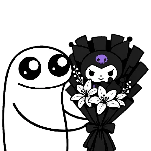 Um personagem de desenho animado com um sorriso largo e olhos grandes oferece um buquê de flores pretas com uma pequena criatura de olhos roxos no centro.