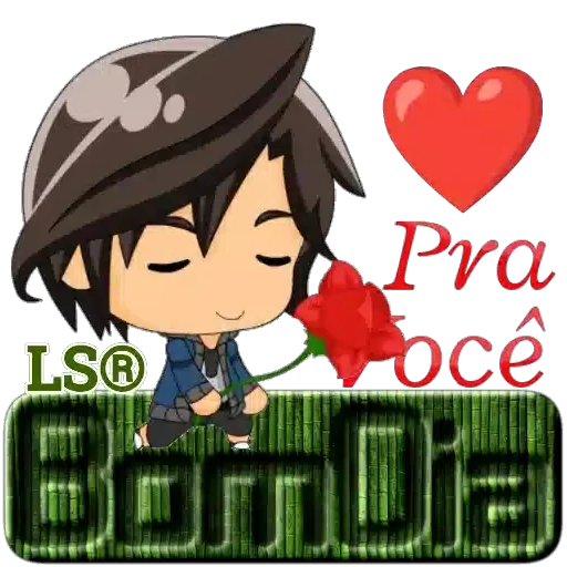 Um menino de anime com cabelos castanhos e um chapéu cinza oferece uma rosa vermelha com um coração vermelho ao fundo e o texto 'Pra você Bom Dia'.