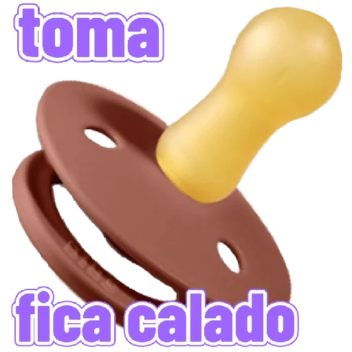 Um bico de borracha marrom com a parte superior amarela e o texto 'toma fica calado' em roxo.