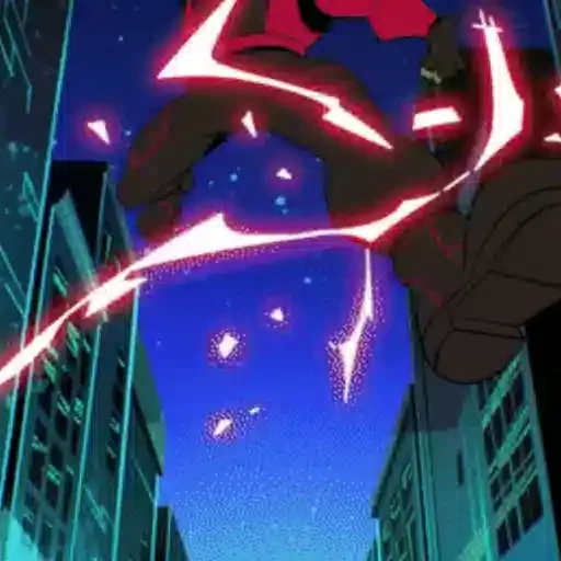 Personagem de anime com cabelo preto e vermelho, expressão séria, com raios azuis saindo de suas mãos.