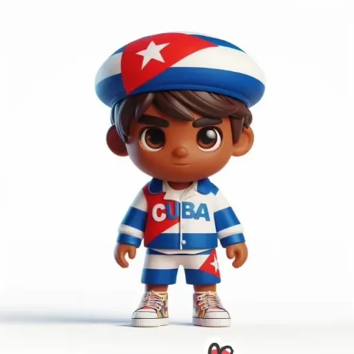Menino de aparência cubana, com chapéu e roupa listrada em azul e branco, com a palavra CUBA no peito.