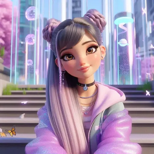 Garota de anime com cabelo lilás e rosa, usando jaqueta rosa, com fundo de escadas e luzes.