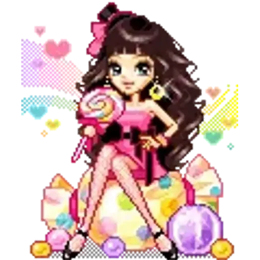 Uma menina de cabelo castanho e vestido rosa sentada em um bolo de doces, segurando um pirarucu de andorinha. Círculos e corações coloridos ao redor.